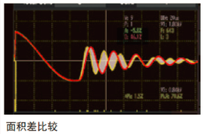 面積比較可用來檢測鉛酸電池芯的正負(fù)極板之間是否絕緣不良或隔離膜不存在。面積比較是將測試的波形總面積與樣品的波形總面積做差異比較,總面積的差異表現(xiàn)出了電池芯絕緣程度的好壞。當(dāng)電池芯正負(fù)極板之間的絕緣不良或是隔離膜不存在時(shí),在足夠的電場強(qiáng)度/電壓下會造成放電,瞬間的能量釋放導(dǎo)致波形瞬間快速衰減, 所以測試的波形總面積會比樣品的波形總面積小。