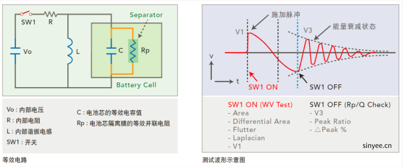 諧振波形中的第三個(gè)電壓峰值。當(dāng)電池芯正負(fù)極板之間的絕緣不良或是隔離膜不存在時(shí),在足夠的電場強(qiáng)度/電壓下會造成放電,能量的釋放會導(dǎo)致第三個(gè)電壓峰值的電壓比良品低。當(dāng)電池芯的絕緣品質(zhì)較差時(shí),因?yàn)槟芰繐p失的較快也較多,也會導(dǎo)致第三個(gè)電壓峰值的電壓比良品低。
