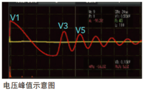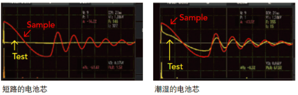 諧振波形中的第一個(gè)電壓峰值。當(dāng)電池芯正負(fù)極板之間的絕緣不良或是隔離膜不存在時(shí),在足夠的電場強(qiáng)度/電壓下會造成放電,會導(dǎo)致第一個(gè)電壓峰值比樣品的第一個(gè)電壓峰值低。