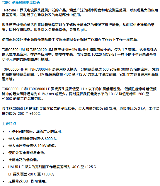 Teledyne T 羅氏電流探頭提供范圍廣泛的產品,涵蓋廣泛的頻率跨度和電流測量范圍,以實現最大的應用覆蓋范圍,同時易于在難以觸及的電路部分中使用。