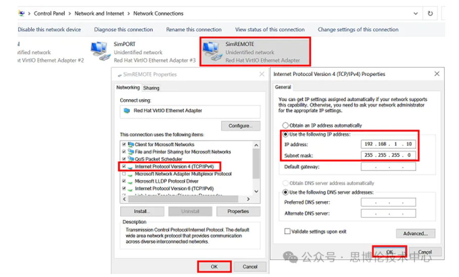 在搜索框輸入View network connections并打開,右擊SimREMOTE,選擇Properties,然后是Internet protocol version 4,設(shè)置Use the following IP address,比如設(shè)為192.168.1.10,然后點OK。