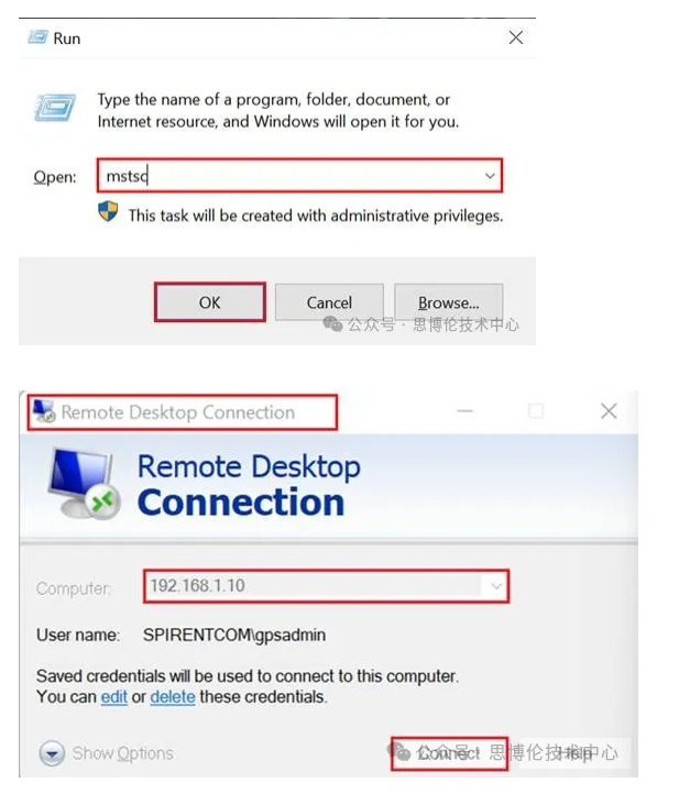 在Win10系統(tǒng)下使用“WIN+R”組合鍵快捷打開運行對話框,然后輸入“mstsc”,點確定;輸入GSS7000剛才設(shè)置的IP 地址:192.168.1.10,賬戶名:gpsadmin,密碼:admin。進入后便可和本地電腦直接進行復(fù)制粘貼等文件傳輸操作。